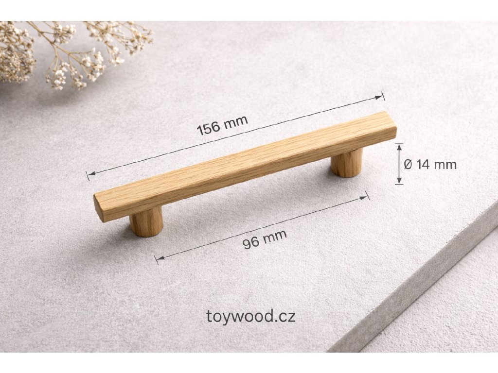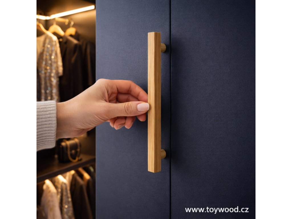 Masivní dubová (nebo buková) lamelová úchytka s roztečí 96 mm v moderním minimalistickém provedení. Kompatibilní s běžným 32mm systémem nábytku. Dodávána včetně montážních šroubů M4×35. Možnost výroby na míru – napište nám na hello@toywood.cz